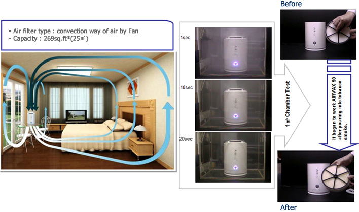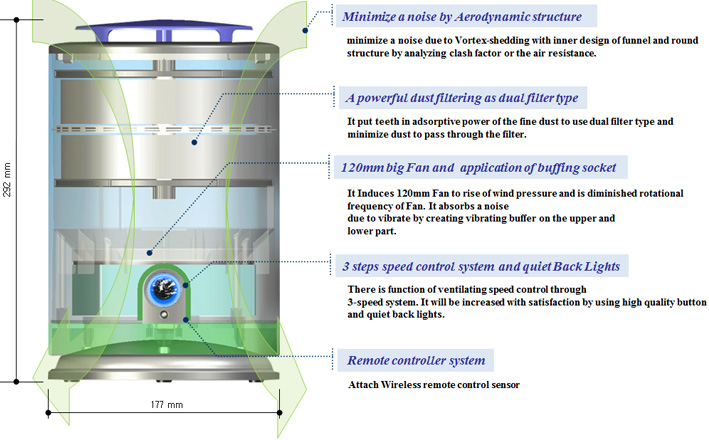 HEPA filter has difficulties in catching fine dusts and an ion method causes Ozone(O3)…