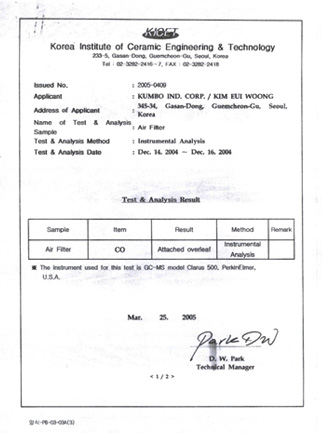 일산화탄소 제거 시험 결과, 자동차 배기, 요리 등에 의해 발생하는 일산화탄소 포집 능력이 탁월하다.