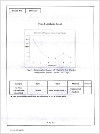 집 또는 사무실에 담배연기의 60% (30% "+", 30% "-")이고, 40%는 무극성인 (50㎚~500㎚) 입자를 e-필름을 통과할 때 유도 정전기에 의해 모두 포집할 수 있다..